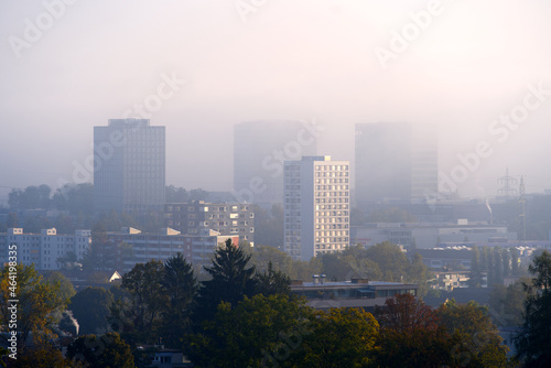 skyline, skyscraper, autumn, fog, building, city landscape, air, architecture, background, building, business, city, downtown, dust, landmark, landscape, mist, nature, north, office, pollution, sky, sunrise, switzerland, travel, tree, urban, view, zurich, zurich