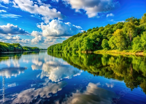 nature, green tree, blue skies, tranquil scene, scenic view, summer, natural beauty, photo, travel destination, river bank, environmental conservation, flowing water, riverside, panoramic view, waterway