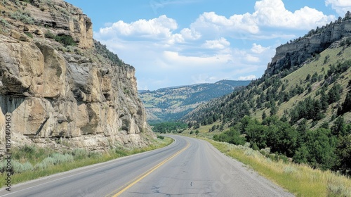 Scenic Mountain Road Surrounded by Majestic Cliffs and Lush Greenery under a Bright Blue Sky with Fluffy Clouds in a Serene Natural Landscape