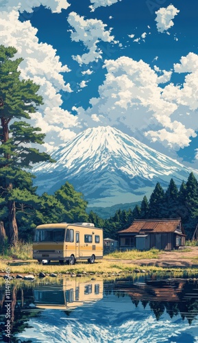 retro, anime, recreational vehicles, mountain, lake, poster, vintage, nature, scenic, travel, adventure, landscape, outdoors, tranquil, snow-capped, tree, forest, camping, illustration, art, peaceful, serene, cloud, calm water, exploration, road trip, graphic, design, leisure, get-away, relaxing, quiet, vacation, weekend, escape, freedom, creative, background, scenery, recreation, heritage, animation, drawing, old school, stylised, concept