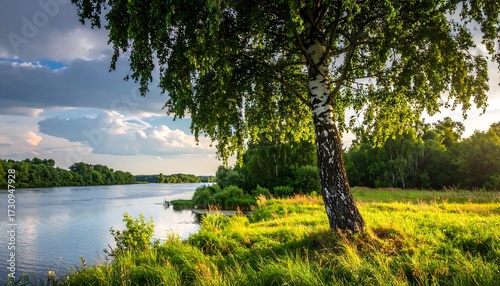 river, tree, birch, sunset, cloud, grass, green, calm, water, nature, landscape, summer, sunlight, scenic, tranquil, outdoors, forest, lush, peaceful, beautiful, riverside, gold, expansive, sky, horizon, reflective, vegetation