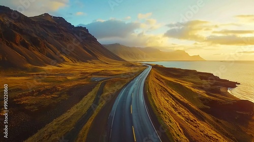 scenic road in Iceland, beautiful nature landscape aerial panorama, mountains and coast at beautiful sunset