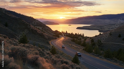 sunrise, sunset, road, mountain, lake, car, travel, landscape, scenic, nature, highway, autumn, summer, morning, evening, view, beautiful, picturesque, drive, journey, adventure, exploration, horizon, sky, cloud, hill, vale, water, tree, gold, light, colours, vibrant, calm, peaceful, tranquil, serene, winding, asphalt, curve, vehicle, destination, vacation, holiday, remote, wilderness, outdoors