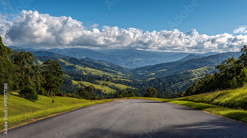 Scenic Valley Road with Rolling Green Hills and Clouds