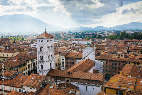 Scenic view of St. Michael Church (Chiesa di San Michele in Foro) from Torre delle Ore. Location Lucca, Tuscany, Italy. Picturesque travel destination postcard.