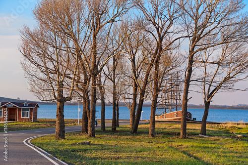 scenery, road, tree, tour tourism, travel, lake, lakeshore, spring, sunset, beautiful, leisure