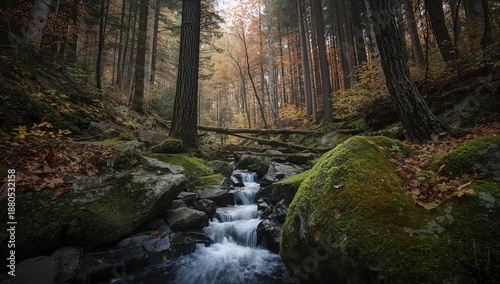 Scenic woodland creek in autumn with soft light and textured forest background