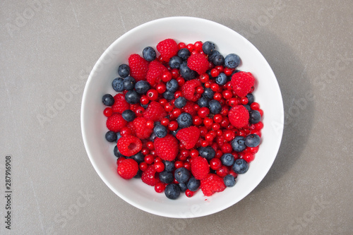 Schale mit Früchten: Blaubeeren, Himbeeren, Brombeeren