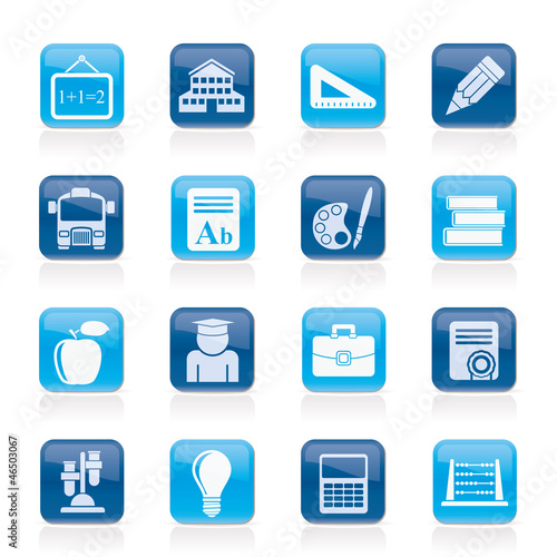 school, education, vector, icon, set, buttons, menu, computer icon, web, site, signs, symbol, background, design, science, cognition, learning, study, lore, blackboard, mathematic, number, building, triangle, geometry, crayons, bus, transportation, school bus, alphabet, literature, drawing, palette, book, apple, student, bag, diploma, laboratory, flask, bulb, calculating machine, technology