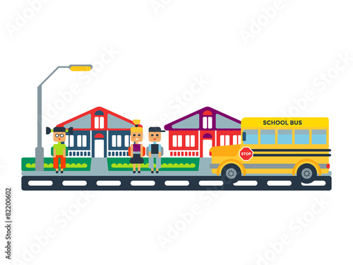 school, bus, route, way, road, illustration, flat, cartoon, bright, fun, preschool, travel, ride, concept, yellow, vector, children, people, simple, vehicle, cute, funny, transport, girl, childhood, transportation, education, trip, children, auto, happy, street, american, city, waiting
