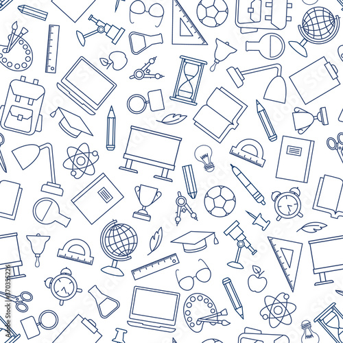 School education seamless pattern. Education symbols sketch backdrop with school supplies. Back to school icons doodle line art notebook background.