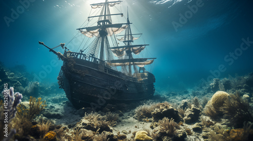Schooner Ship Vintage view of a sailing ship, a sunken ship. Grand view of an old sailing ship from the times of pirates and the Middle Ages on the high seas in underwater, background