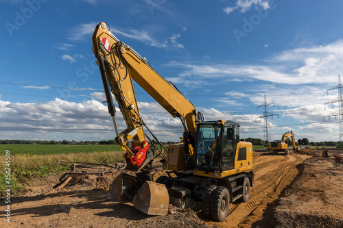 power shovel, bulldozer, roller, machine, appliance, industry, under construction, construction, project, public works, roadwork, construction work, construction, construction industry, excavate, street, interstate, foundation, hydraulic, earth, sand, yellow, blue skies