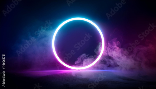 Sci Fi modern. Futuristic smoke. Neon color geometric circle on a dark background. Round mystical portal.