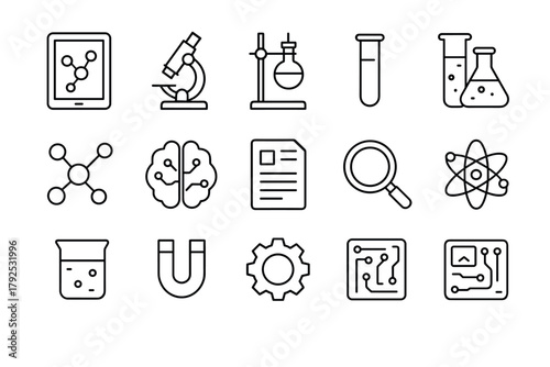 line, icon, science, technology, laboratory, research, chemistry, biology, microscope, molecular, brain, document, flask, test tube, analysis, magnifying glass, atom, beaker, magnet, gear, circuit, blueprint, innovation, education, cognition