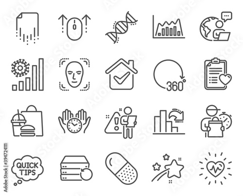 Science icons set. Included icon as Capsule pill, Patient history, Recovery file signs. Coronavirus statistics, Recovery server, Face detection symbols. Quick tips, Safe time, 360 degrees. Vector