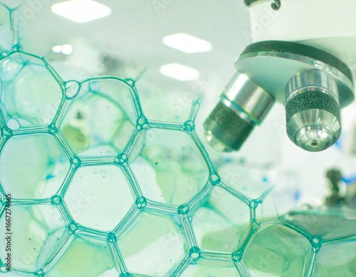 Scientific microscope analyzing cellular structure, close-up of biological sample with hexagonal shapes, concept of microbiology, biotechnology, medical research and laboratory science innovation