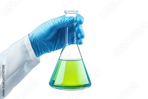 Scientist holding a green liquid in a flask in a laboratory during a research experiment