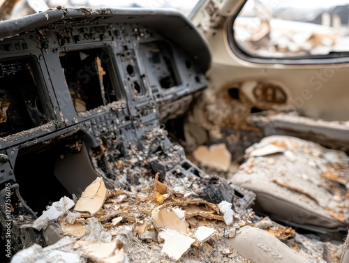 Scorched airplane cockpit with shattered windows, rescue teams searching for survivors amidst the wreckage.