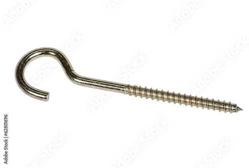 screw, threaded, sharp, spiked, loop, hinge, hook, crook, piton, hanger, grapple, fastener, metal, steel, tool, wood, home, repair, repairing, improvement, isolated, white, background, craft, hardware, fix, no, people, nobody, building, industrial, slanted, inserting, fasten, directly, construction, concept, photo, image, closeup, macro, shot, studio
