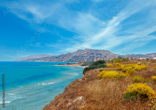 sea, coast, beach, bay, europa, mediterranean, agrigento, aquamarine, beautiful, blue, coastline, environment, flower, hill, holiday, island, italy, landscape, mountain, natural, nature, ocean, plant, seascape, shore, sicilia, sicilia, summer, thistle, tour tourism, travel, vacation, view, water, yellow, blossom, blossoming, panorama, wide, town, house, rock, sky, cloud