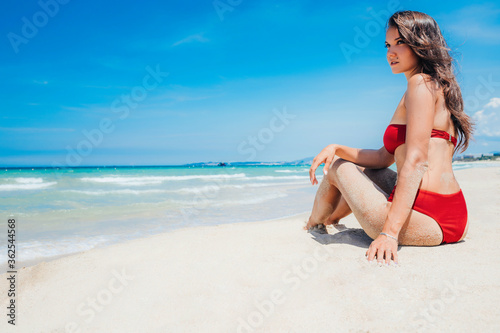 Sea beach A beautiful young tanned girl in a red bikini, paradise tropical white sand beach. Pretty woman enjoys the moment being in the Maldives