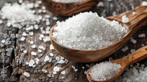 Sea salt displayed on wooden surface