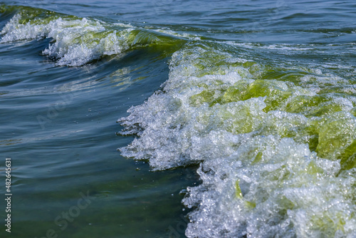 Sea wave with spray and foam near the shore