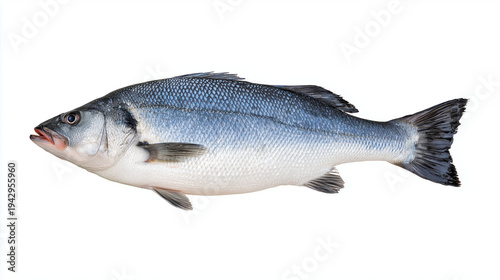 seabass. A fresh sea bass isolated on white, highlighting its texture and freshness in a simple composition. menu design.