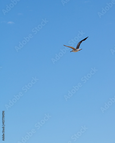 Seagull flying high in the clear blue sky. Vertical image with empty space for text