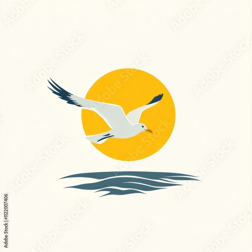 seagull, bird, ocean, sea, sunset, sun, fly, flying, wing, water, sky, beach, coast, summer, nature, wildlife, animal, freedom, travel, holiday, vacation, wave, horizon, yellow, white, blue, graphic, design, illustration, vector, artwork, image, picture, symbol, icon, element, scene, view, landscape, abstract, artistic, vibrant, peaceful, serene