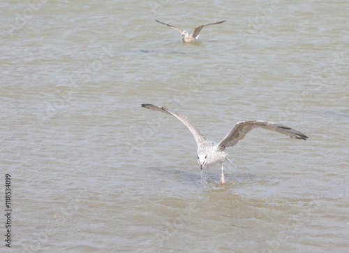 seagulls in the sea water searching for small fish