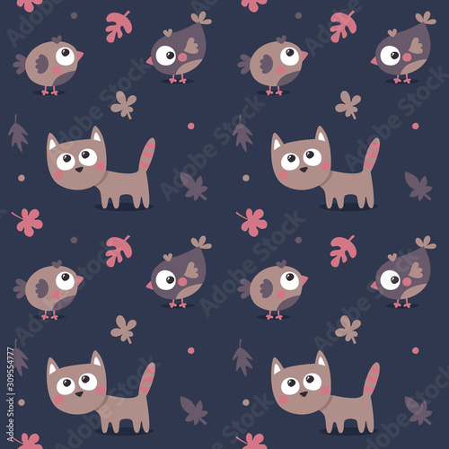 Seamless animal autumn pattern made with cat, bird, flower, plant, leaf
