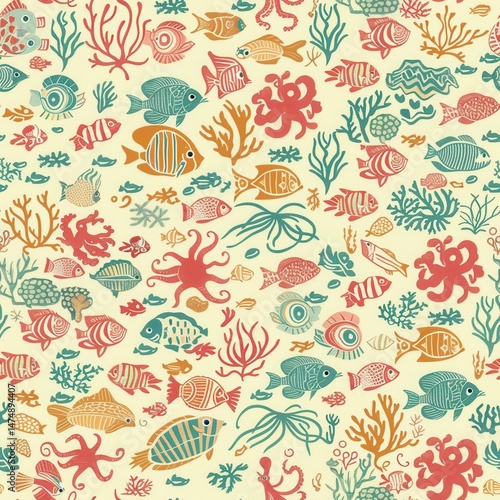 seamless aquatic cartoon pattern with playful sea creatures, pastel corals, and underwater plants, bright happy colors