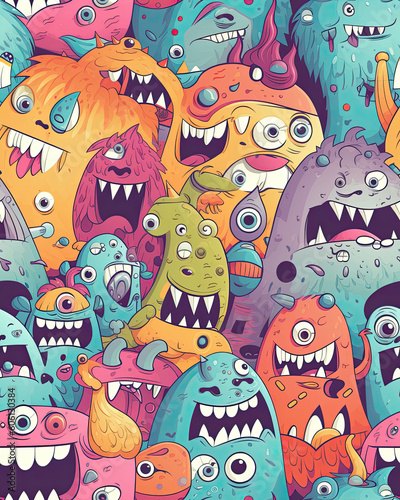 monster, funny, colourful, seamless pattern, tile, playful, cartoonish, whimsical, imaginative, creative, furry, cute, adorable, quirky, silly, groovy, bold, vibrant, happy, joyful, playtime, fantasy, magic, scribble, bizarre, funky, oddball, bright, wild, zany, cheerful, wacky, laughter, fun, unique, ai, generated, image