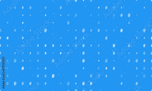 Seamless background pattern of evenly spaced white owl symbols of different sizes and opacity. Vector illustration on blue background with stars