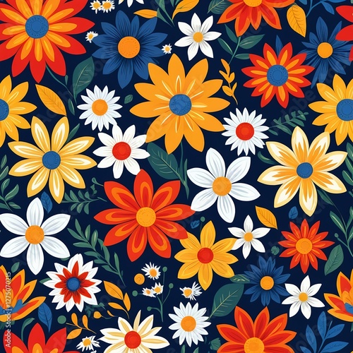 seamless, floral, flower, flower, blossom, bloom, botanical, daisy, sunflower, orange, yellow, red, blue, white, dark blue, textile, fabric, vibrant, colourful, bright, summer, spring, nature, plant, leaf, foliage, repeat, retro, vintage