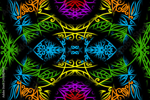seamless colourful caleidoscope gradient flower and leaf line art pattern of indonesian culture traditional tenun batik ethnic dayak ornament for wallpaper ads background