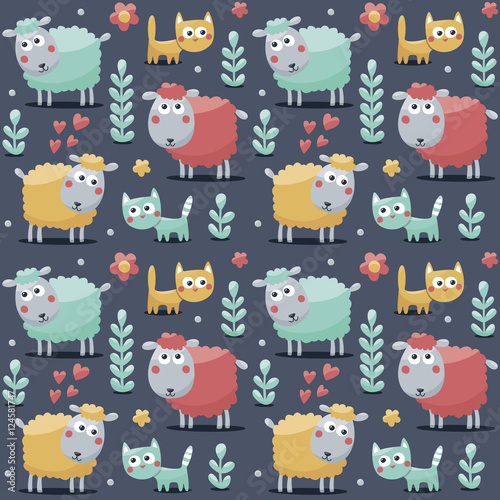 Seamless cute pattern made with sheeps, cats, flowers, animals, plants, hearts for kids