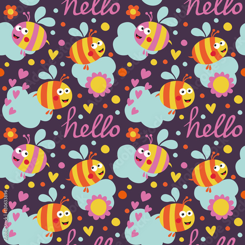 decoration, fly, baby, print, cloud, flower, vector, unique, childish, enjoy, circle, character, bee, word, hallo, walk, love, cute, funny, friends, wing, collection, design, stripes, colourful, children, art, honey bee, beautiful, children, zoo, tree branch, seamless, pattern, eye, cartoon