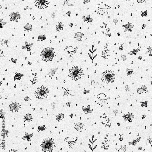 spring, pattern, doodle, flower, bird, bee, butterfly, cloud, sun ray, raindrop, leaf, hand-drawn, nature, vignetting, art, craft, design, background, creative, decor, illustration, seamless, floral, whimsical, cute, playful, insect, sky, garden, weather, joy, seasonal, fresh, colours, simple, texture, art, hand-made