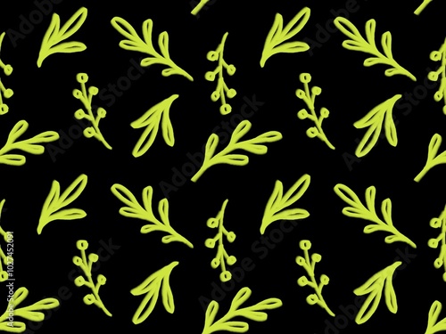 Seamless floral pattern with green yellow plant elements on a black background. Laconic and stylish design with minimalistic branches, ideal for textiles, wallpaper and packaging.