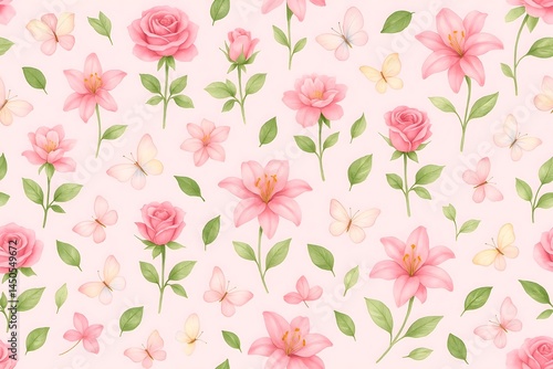 pink, rose, lily, butterfly, seamless, watercolor, soft, pastel, floral, garden, bloom, leaf, spring, vector, flower, wallpaper, illustration, pattern, flower, design, art, vintage, blossom, decoration, texture, summer, textile, beauty