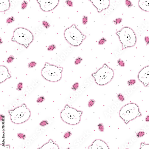 Seamless funny pattern with funny head cats and strawberry.