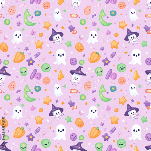 Seamless Halloween pattern with cute ghosts, stars, and candy on a pastel pink background