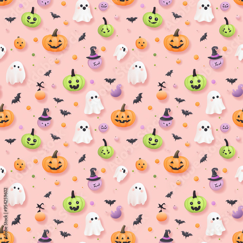 Seamless Halloween pattern with ghosts, pumpkins, and bats on a pastel pink background