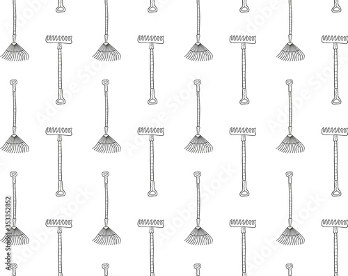 Seamless pattern of black outline garden and kailyard rakes with handles on a white background. Stylized hand drawing. Endless monochrome doodles pattern. Vector gardener tools.