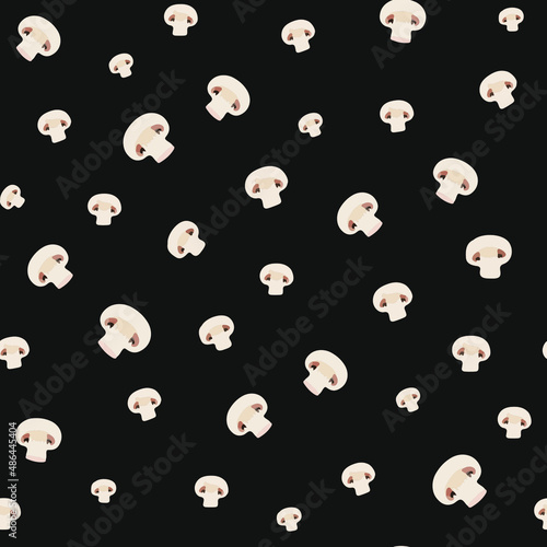 Seamless pattern of champignons different sizes on black background. Mushroom. Flat food