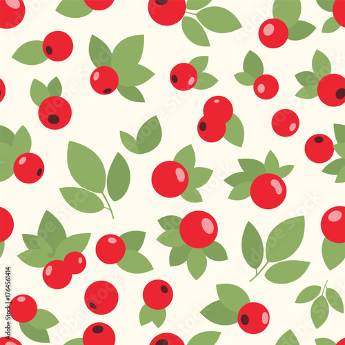 Seamless Pattern of Red Berries and Green Leaves.