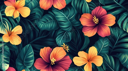 tropical, floral, bouquet, seamless, pattern, vibrant, spring, leaf, fabric, wallpaper, decorative, print, botanical, colourful, lush, nature, exotic, greenery, design, textile, repetition, bold, artistic, trendy, no people